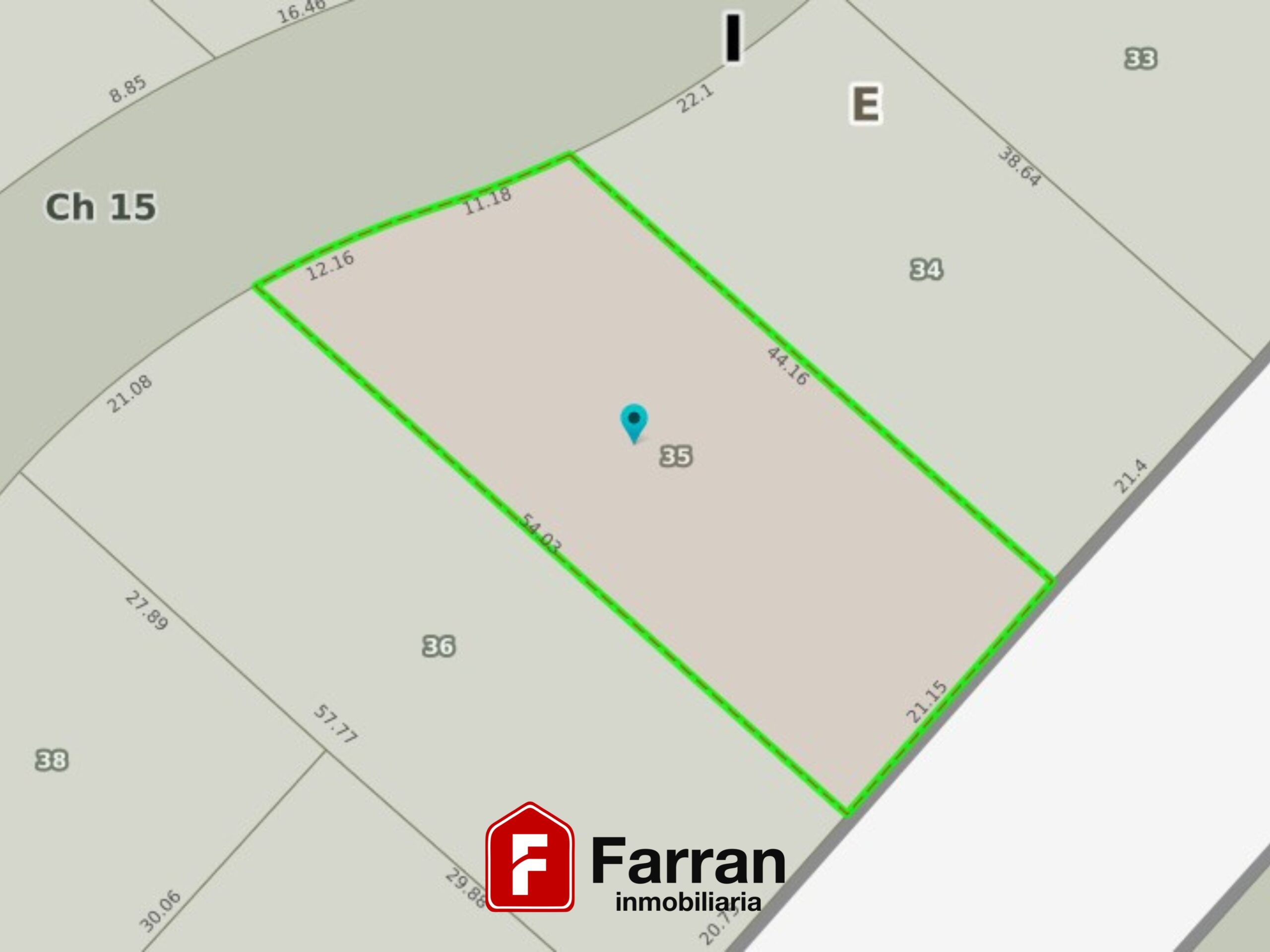 Medidas irregulares: Aproximadas 21 metros en su frente y fondo, por 44 metros en uno de sus laterales y 54 metros en el otro.